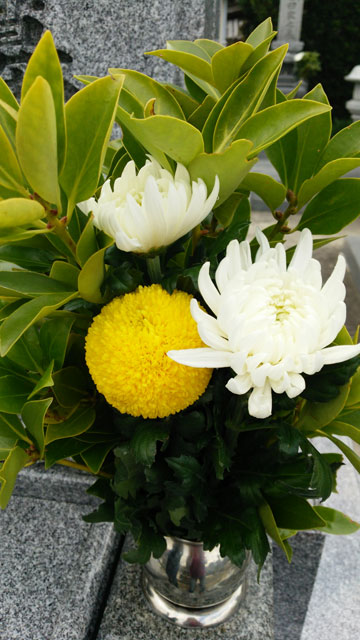 お供えとしてのお花は、白とグリーンで、墓前は義父が好きだった菊の花を入れて、とお願いしました。