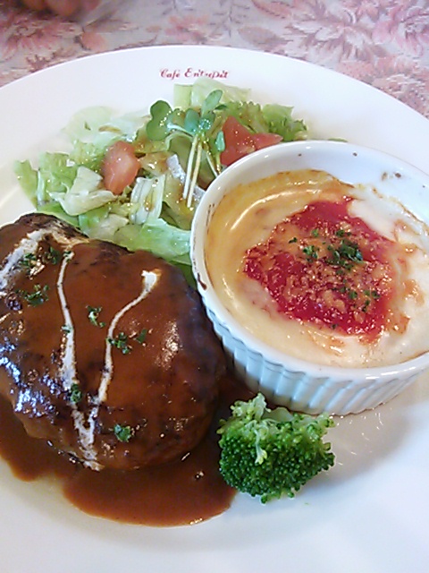 日替わりランチ(お魚のグラタンとハンバーグ)です。画像のほかにはかぼちゃのポタージュとパン(orライス)、手作りデザートがついています。850円。